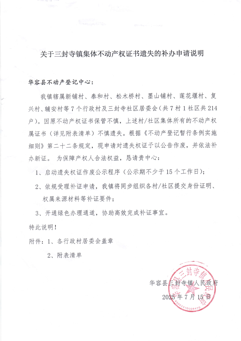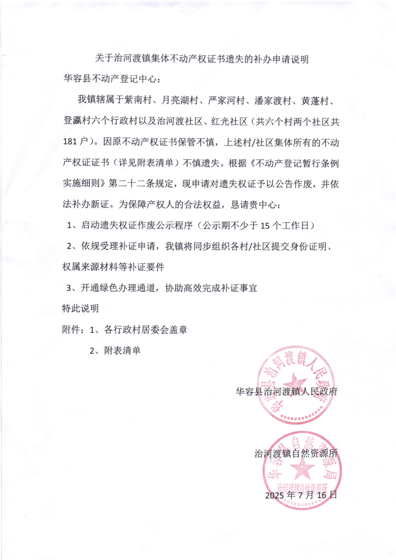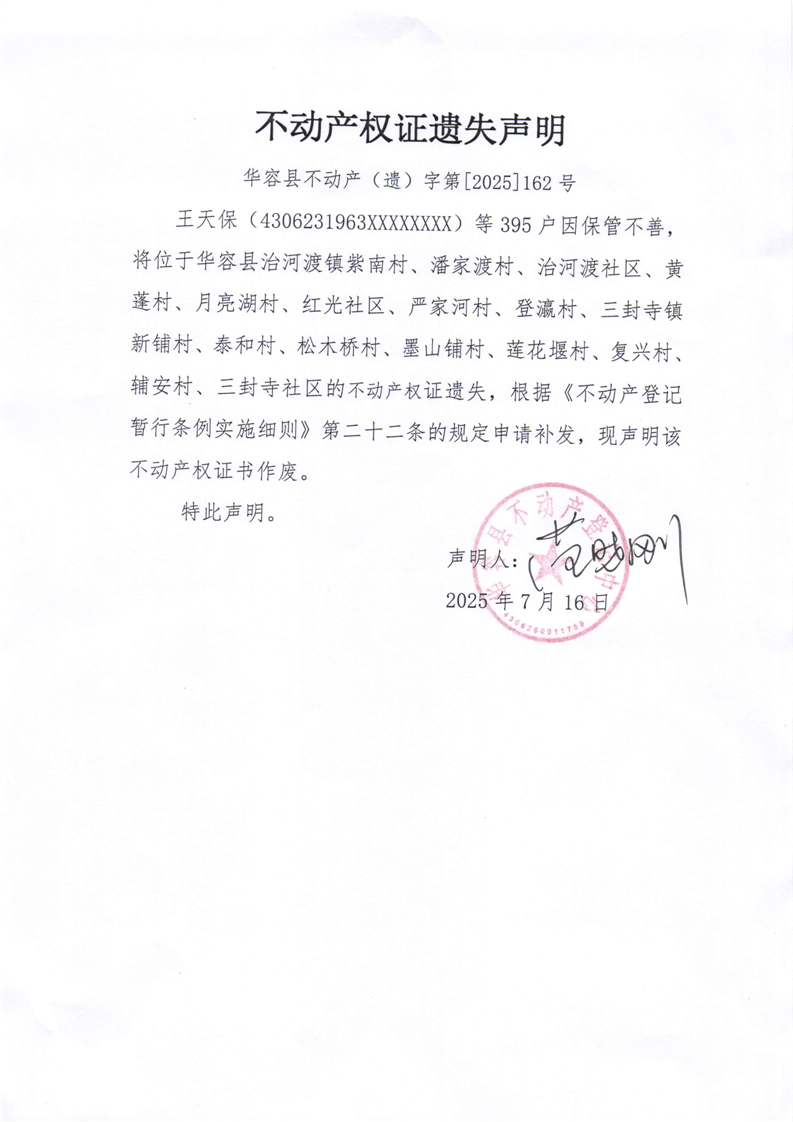 不动产权证遗失声明(华容县治河渡紫南村、潘家渡村、治河渡社区、黄蓬村、月亮湖村、红光社区、严家河村、登瀛村、三封寺镇新铺村、泰和村、松木桥村、墨山铺村、莲花堰村、复兴村、辅安村、三封寺社区))
