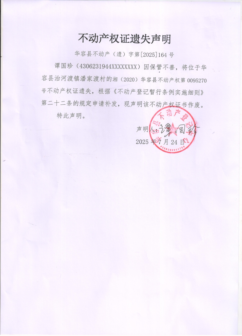 不动产权证遗失声明(谭国珍)