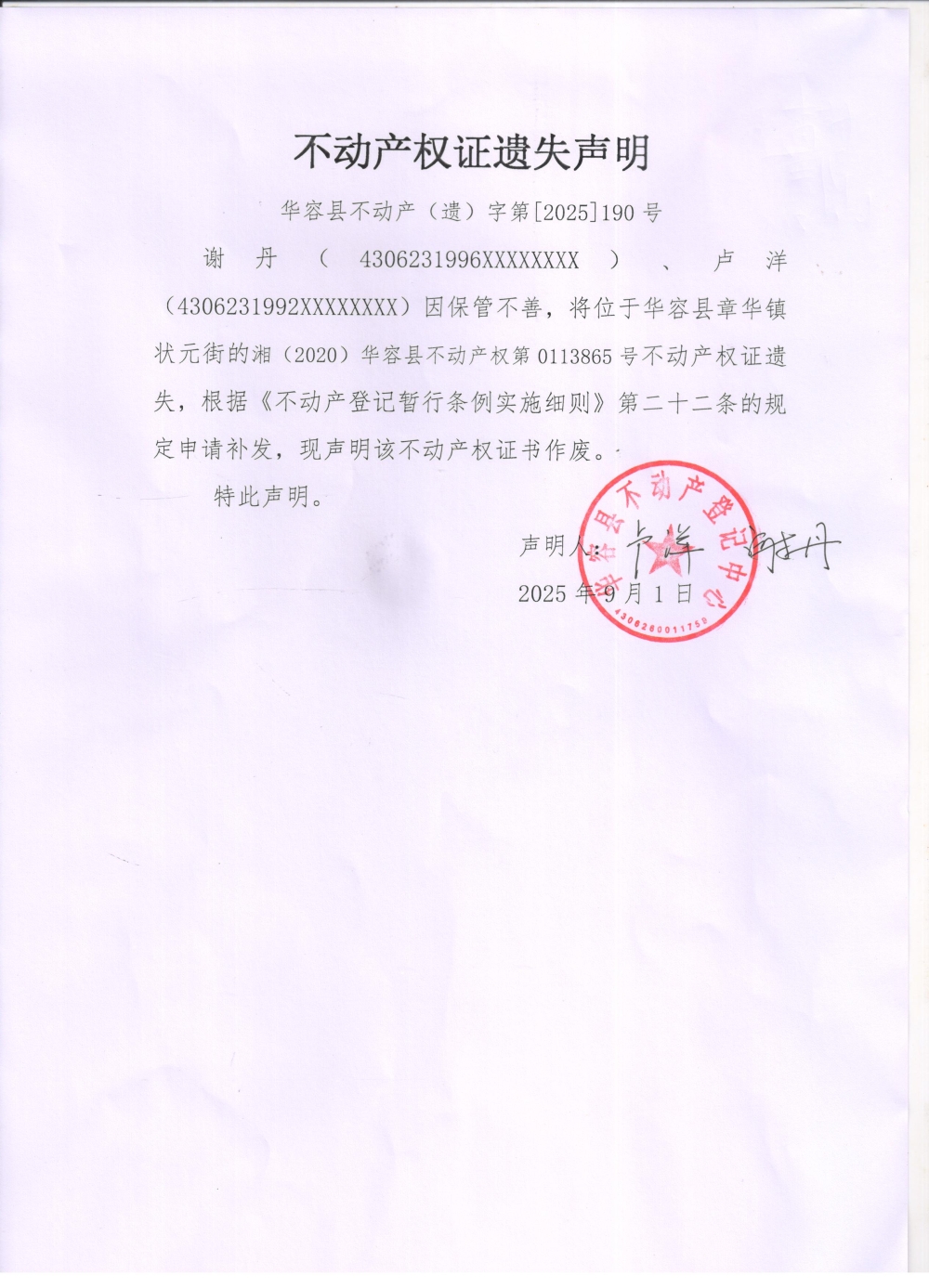 不动产权证遗失声明(谢丹 卢洋)