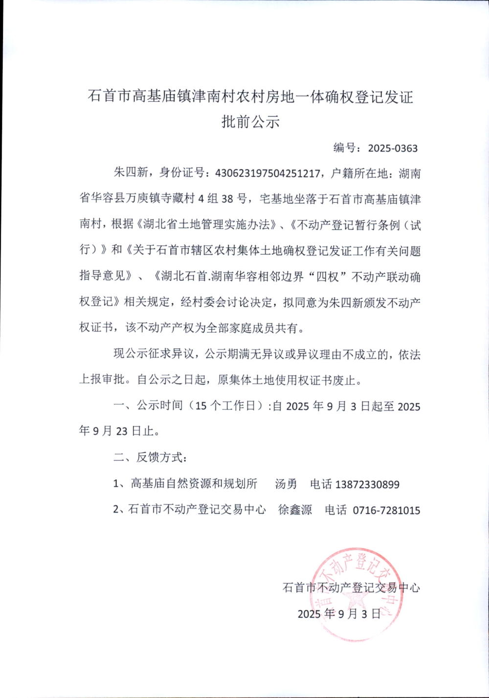 石首市高基庙镇津南村农村房地一体确权登记发证批前公示(朱四新)