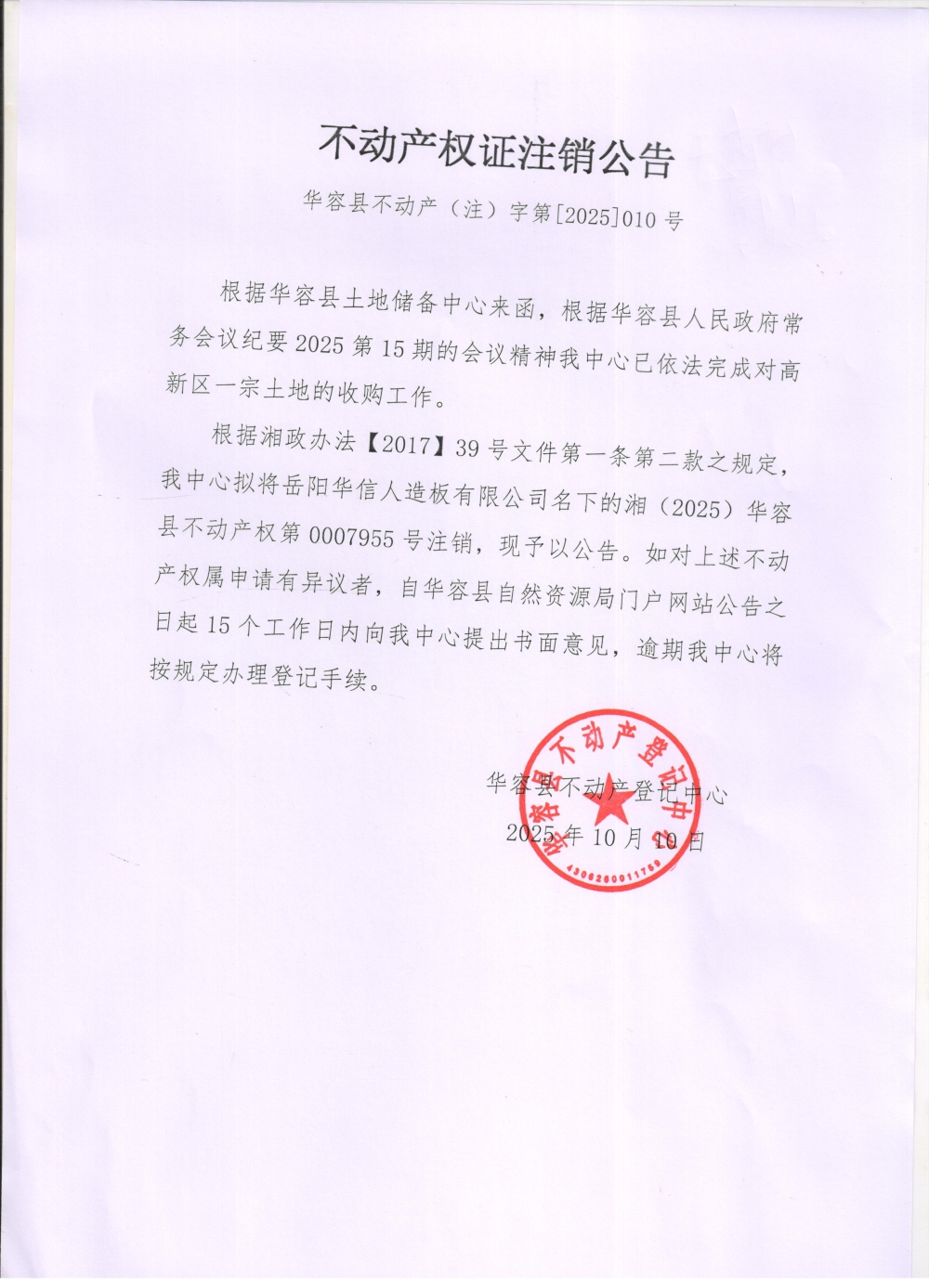 不动产权证注销公告(岳阳华信人造板有限公司)