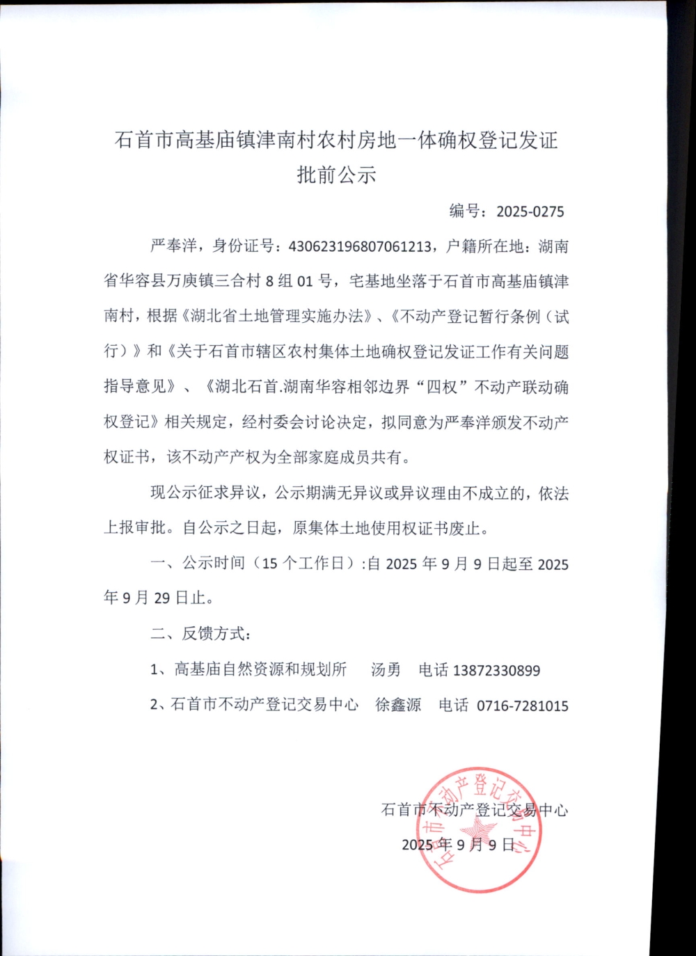 石首市高基庙镇津南村农村房地一体确权登记发证批前公示( 严奉洋)