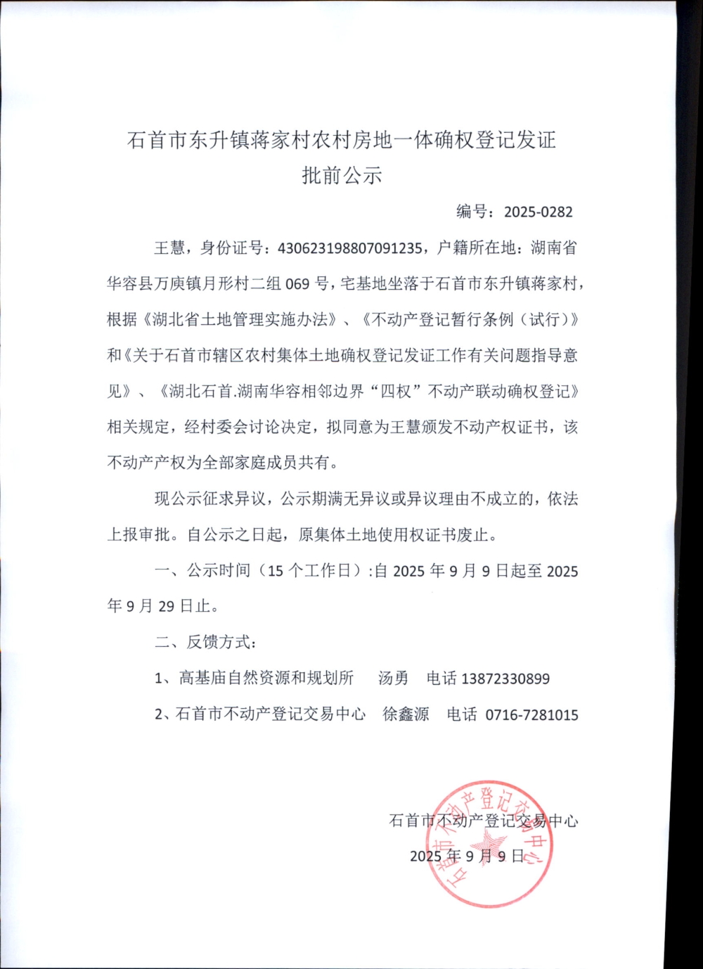 石首市东升镇蒋家村农村房地一体确权登记发证批前公示( 王慧)