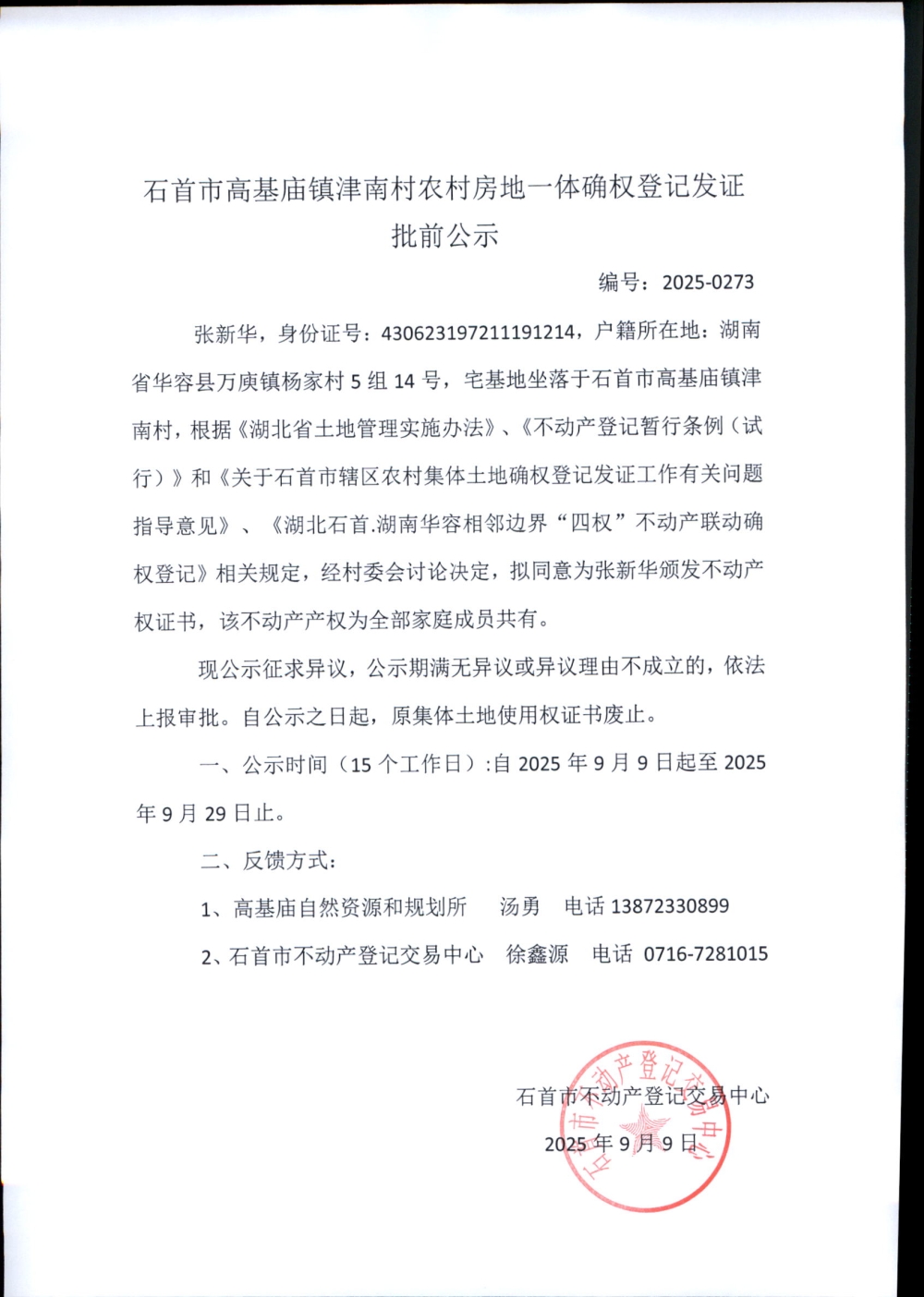 石首市高基庙镇津南村农村房地一体确权登记发证批前公示( 张新华)