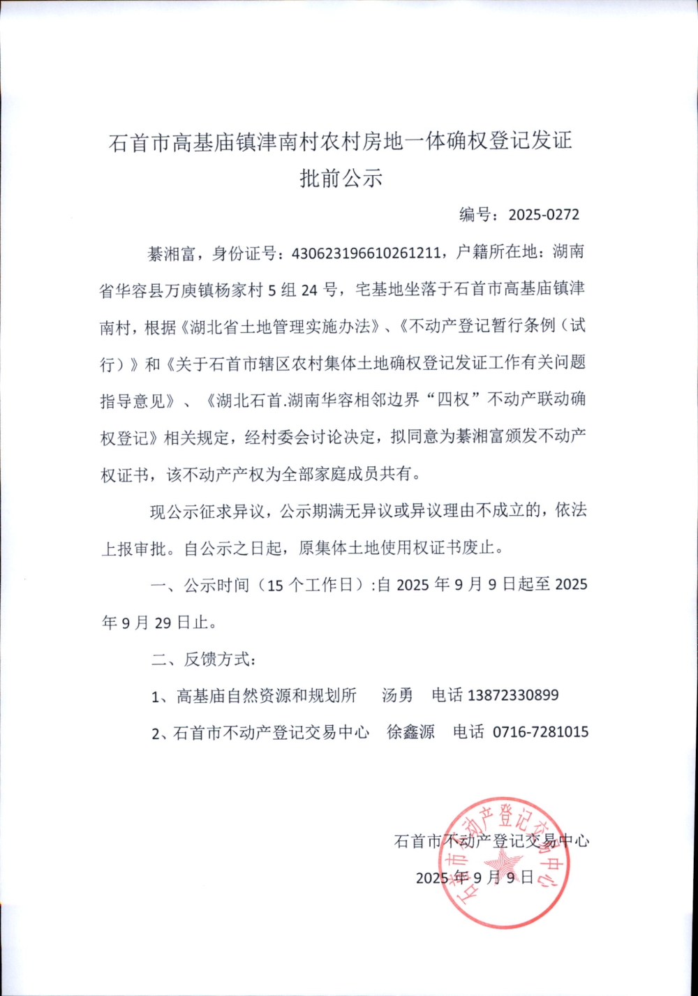 石首市高基庙镇津南村农村房地一体确权登记发证批前公示( 綦湘富)