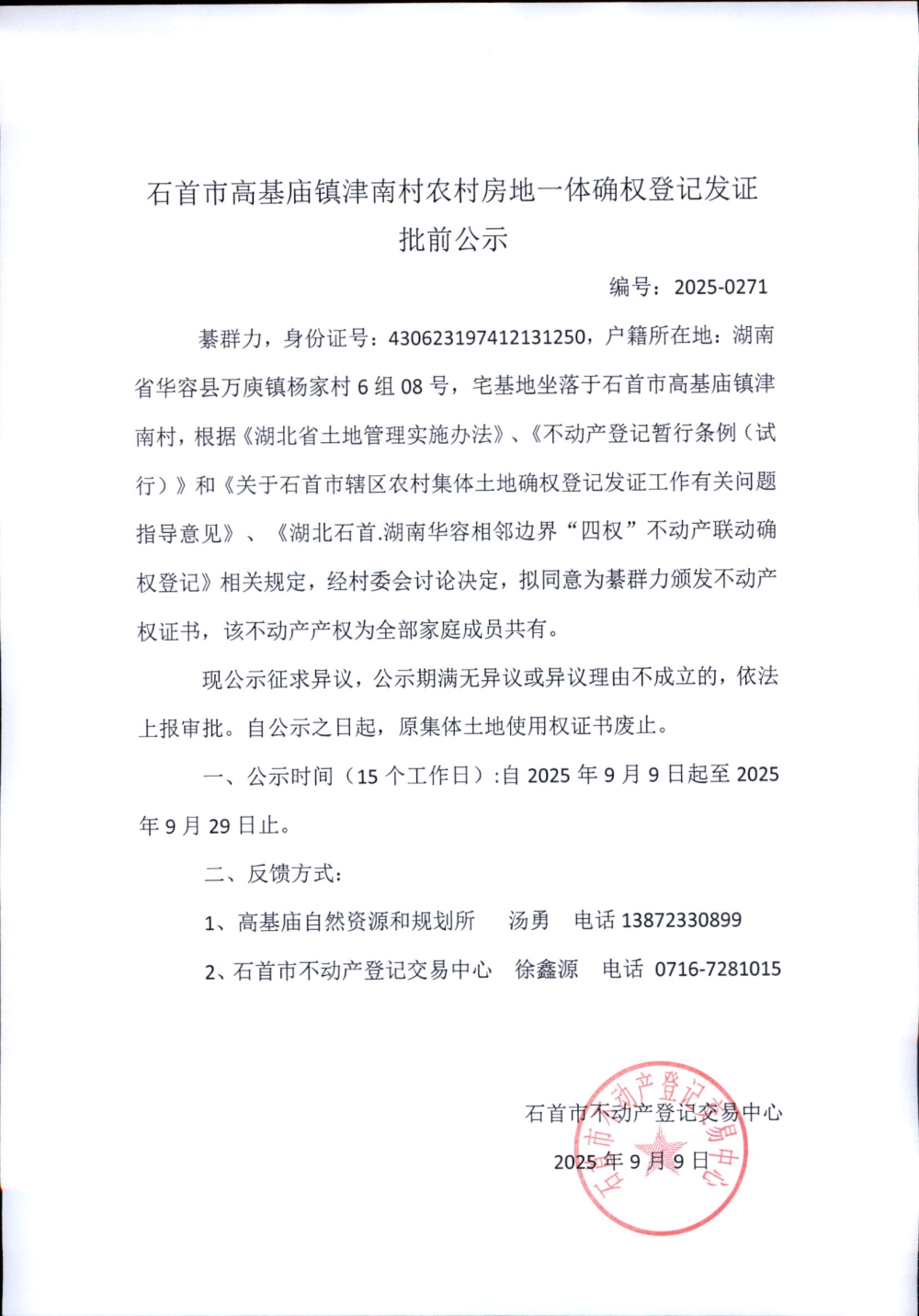 石首市高基庙镇津南村农村房地一体确权登记发证批前公示( 綦群力)