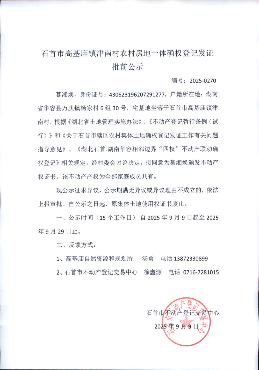 石首市高基庙镇津南村农村房地一体确权登记发证批前公示( 綦湘焕)