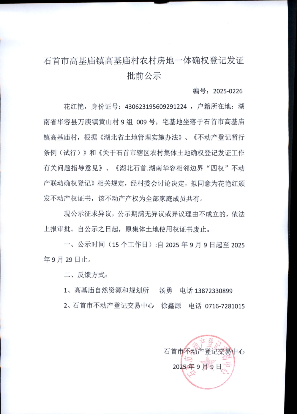 石首市高基庙镇高基庙村农村房地一体确权登记发证批前公示( 花红艳)