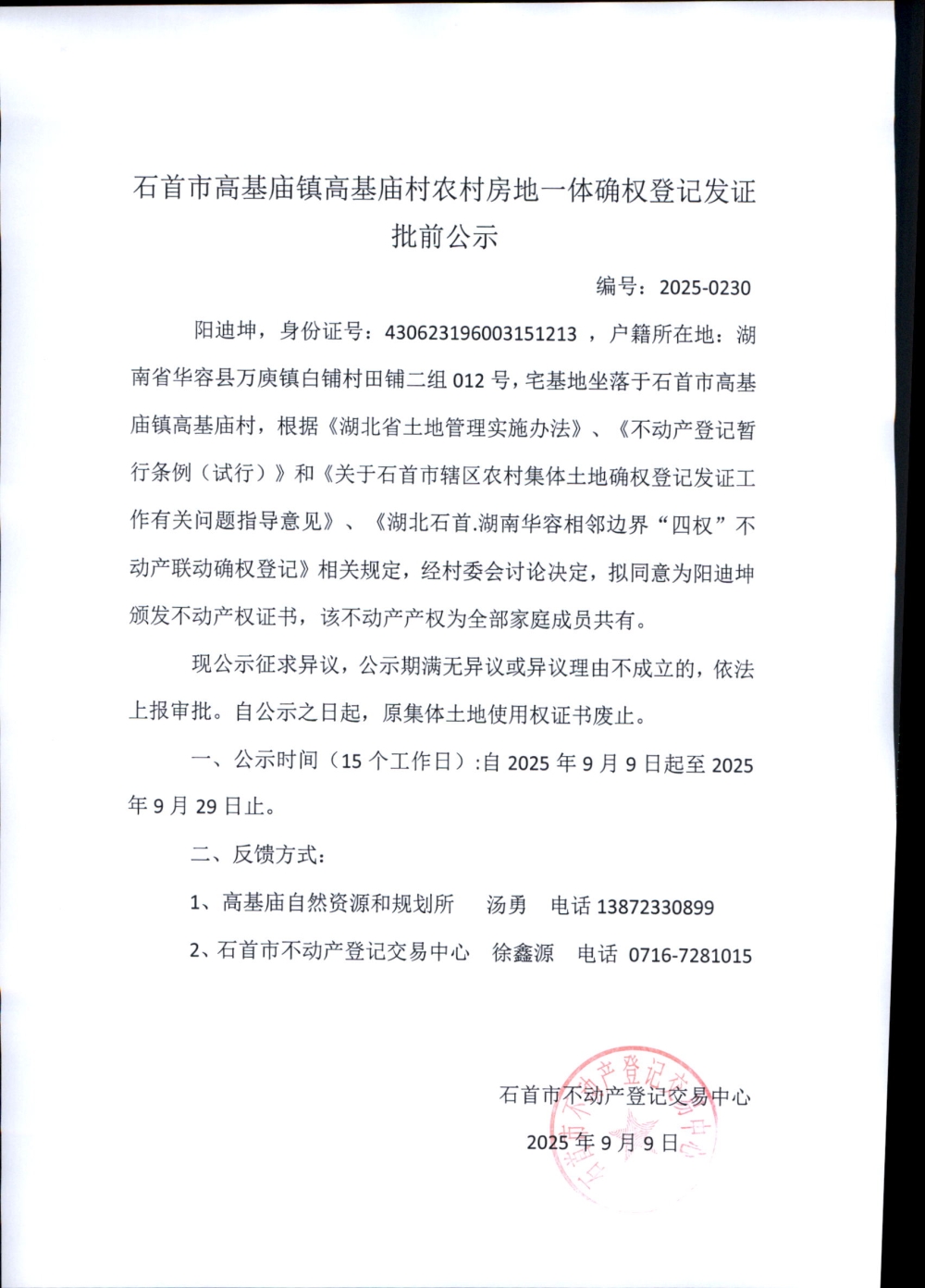 石首市高基庙镇高基庙村农村房地一体确权登记发证批前公示( 阳迪坤)