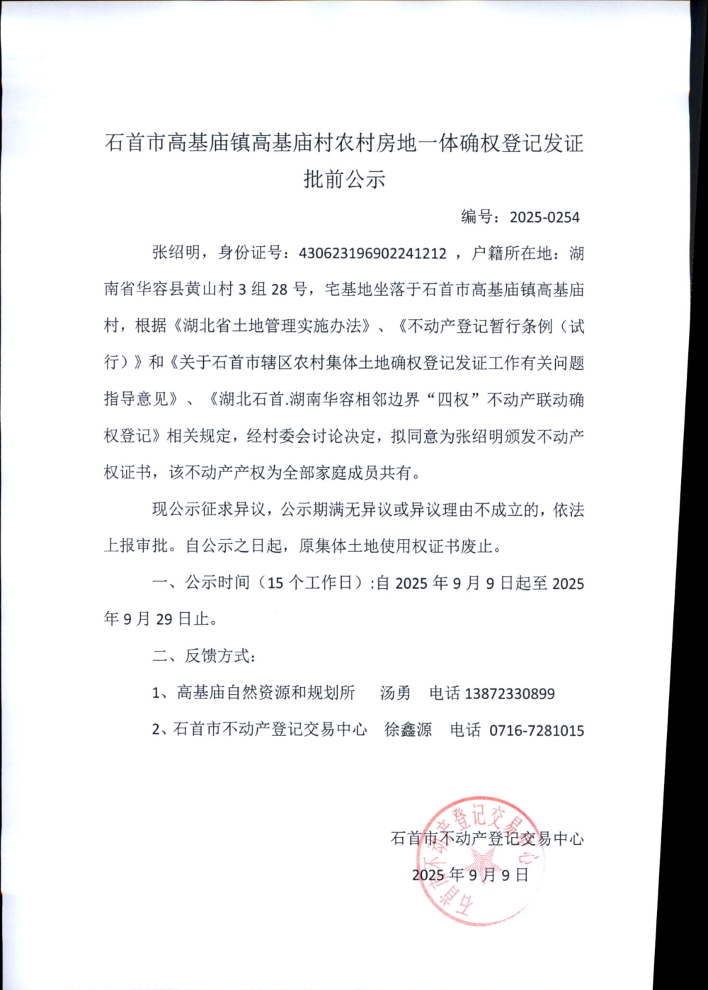 石首市高基庙镇高基庙村农村房地一体确权登记发证批前公示( 张绍明)