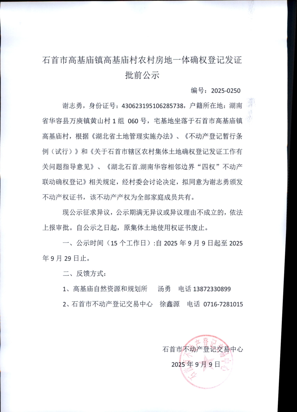 石首市高基庙镇高基庙村农村房地一体确权登记发证批前公示( 谢志勇)