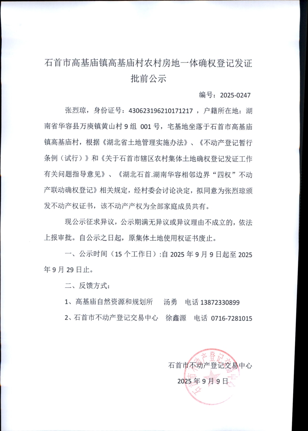石首市高基庙镇高基庙村农村房地一体确权登记发证批前公示( 张烈琼)