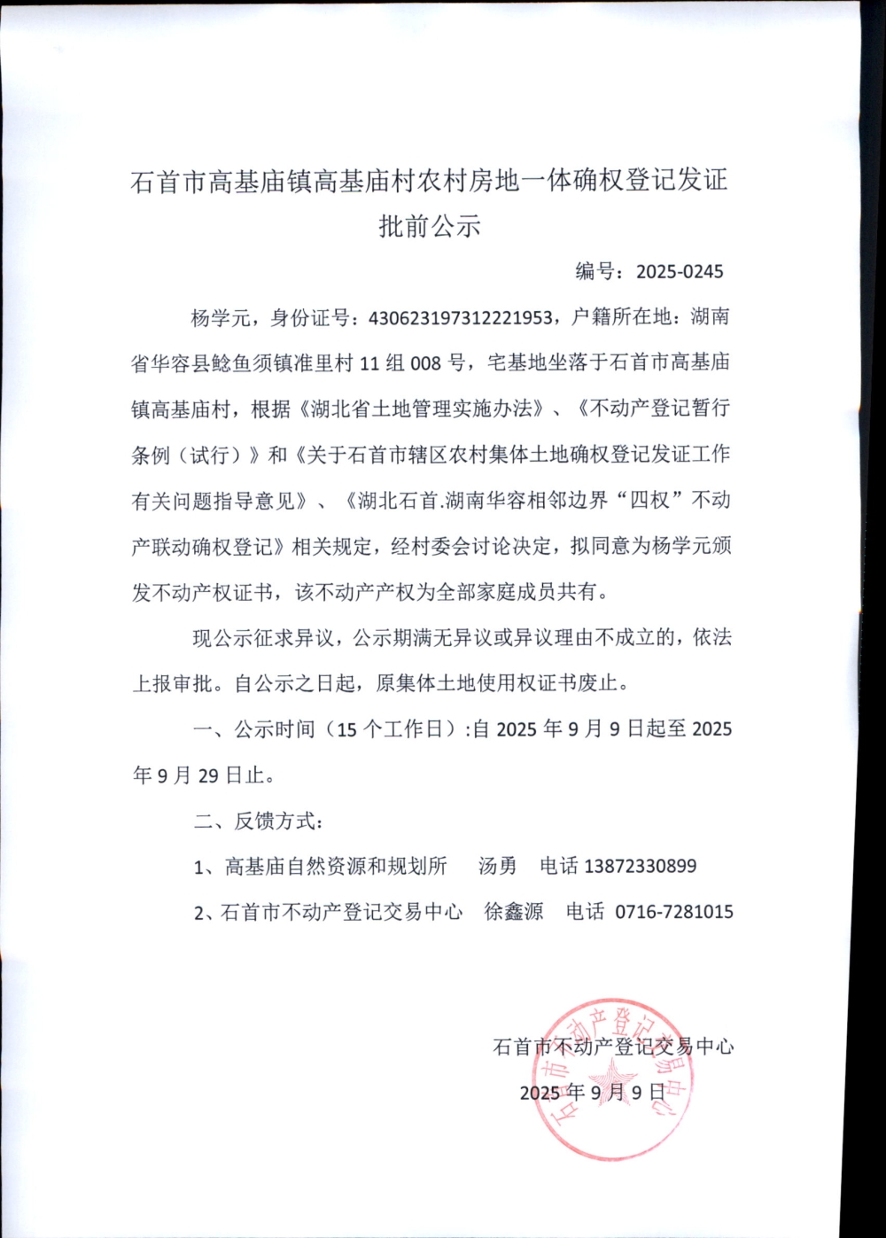 石首市高基庙镇高基庙村农村房地一体确权登记发证批前公示( 杨学元)