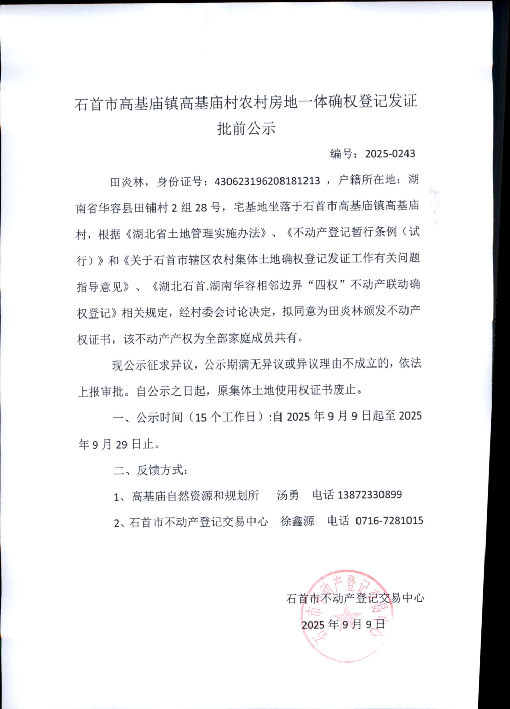 石首市高基庙镇高基庙村农村房地一体确权登记发证批前公示( 田炎林)