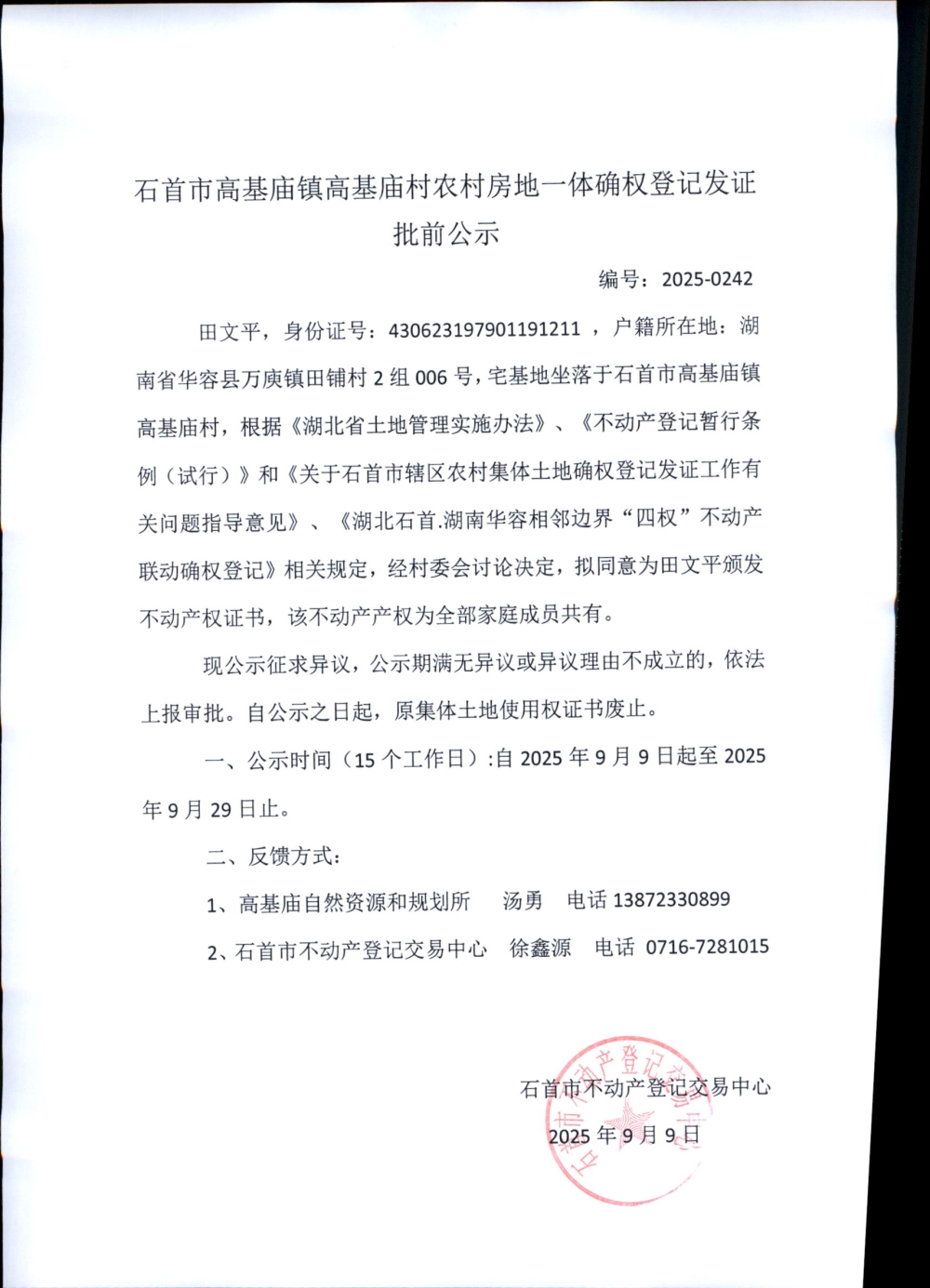 石首市高基庙镇高基庙村农村房地一体确权登记发证批前公示( 田文平)