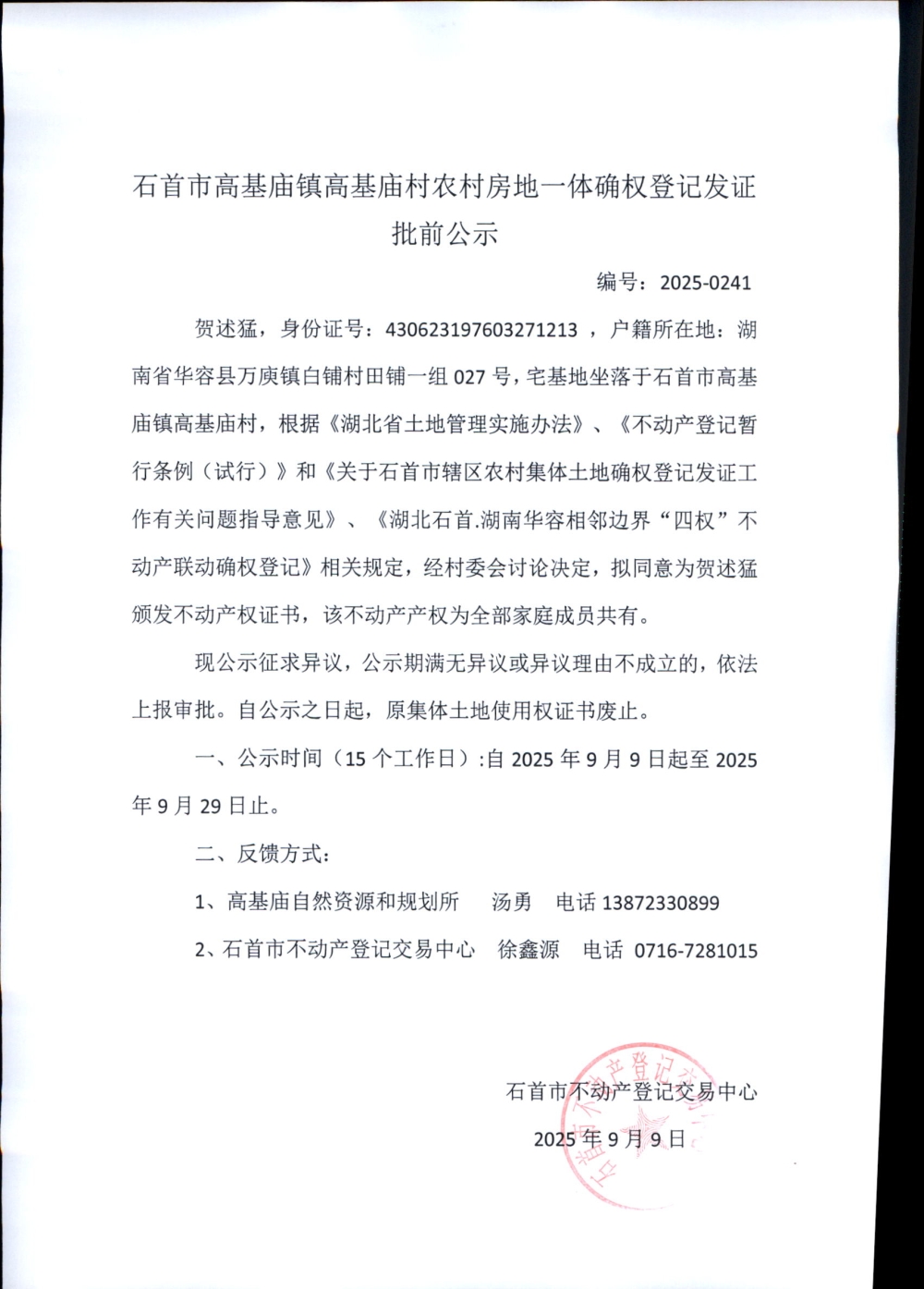 石首市高基庙镇高基庙村农村房地一体确权登记发证批前公示( 贺述猛)