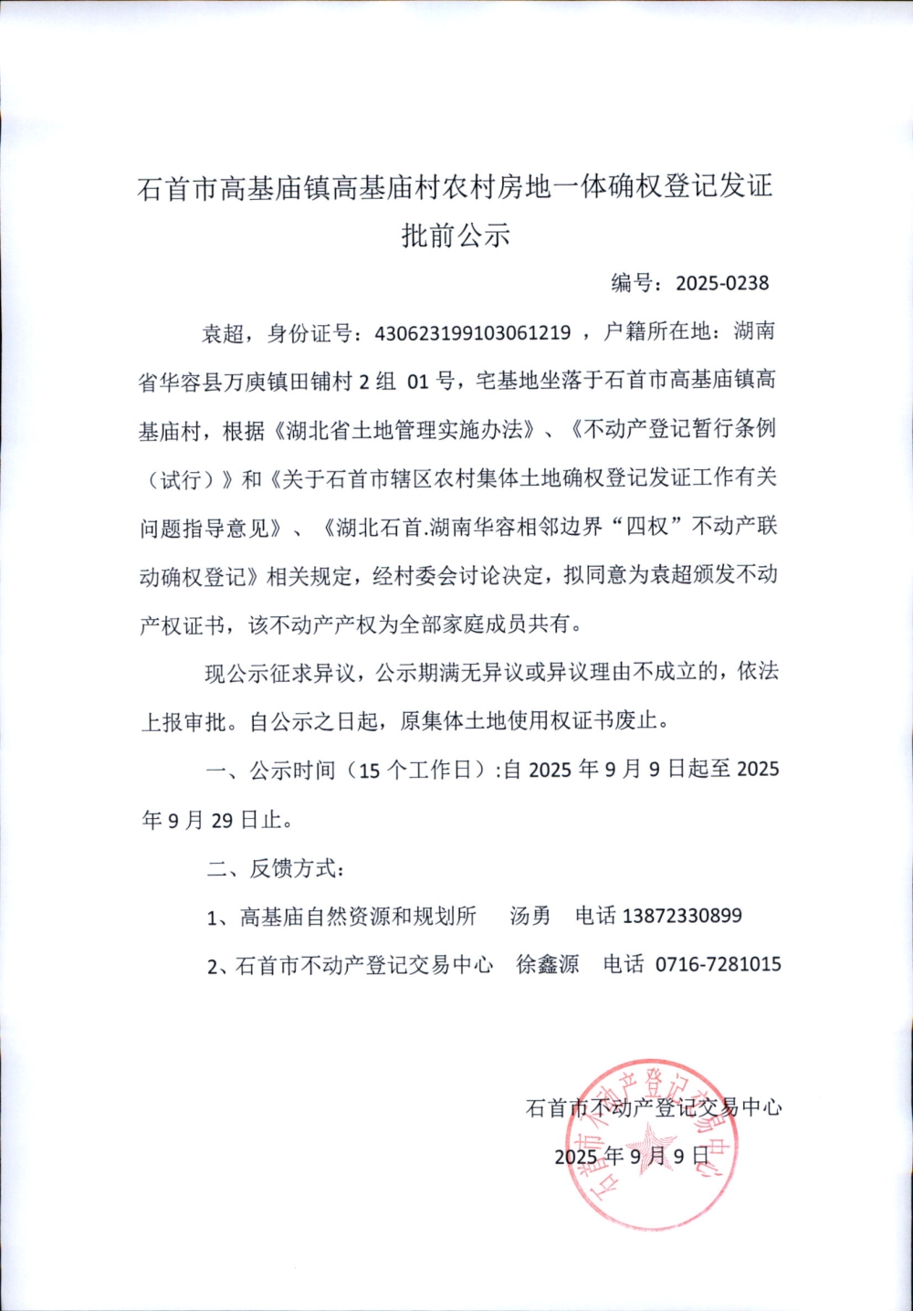石首市高基庙镇高基庙村农村房地一体确权登记发证批前公示( 袁超)