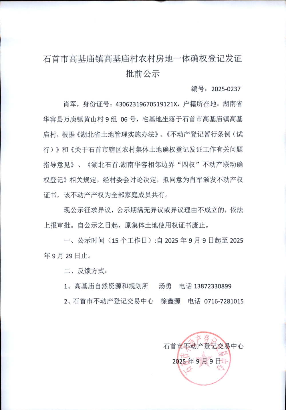 石首市高基庙镇高基庙村农村房地一体确权登记发证批前公示( 肖军)