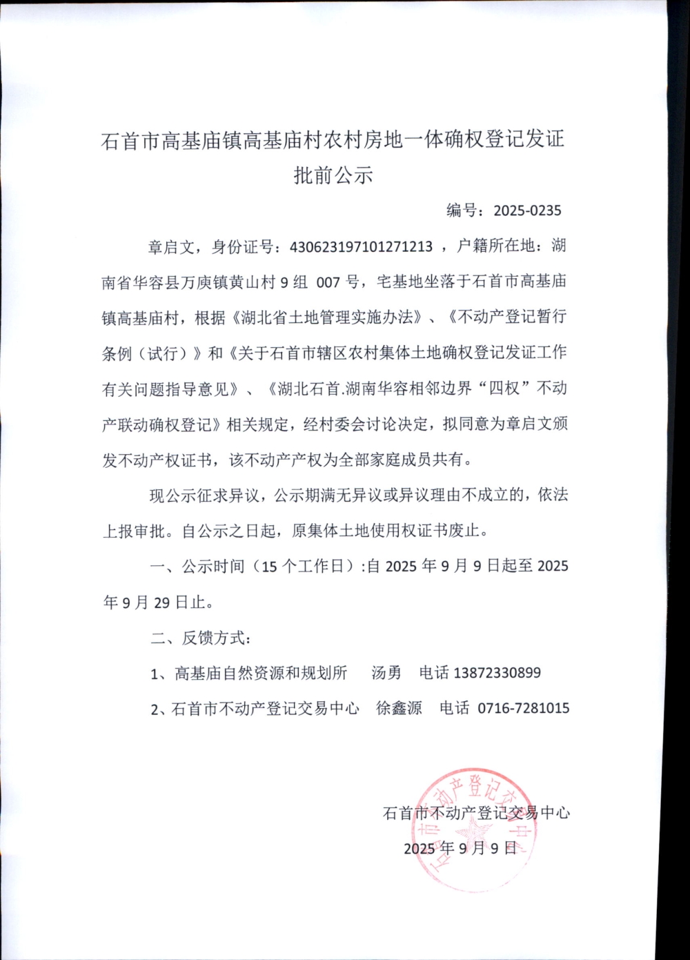 石首市高基庙镇高基庙村农村房地一体确权登记发证批前公示( 章启文)