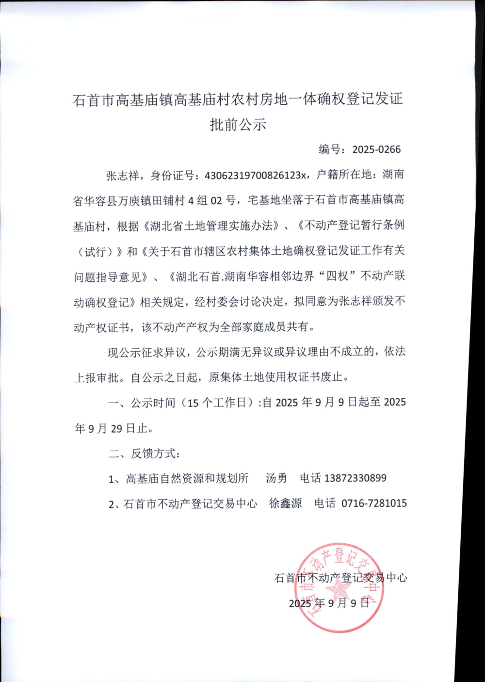 石首市高基庙镇高基庙村农村房地一体确权登记发证批前公示( 张志祥)