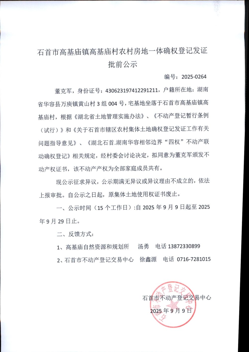 石首市高基庙镇高基庙村农村房地一体确权登记发证批前公示( 董克军)