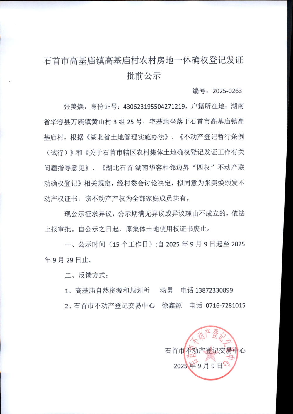 石首市高基庙镇高基庙村农村房地一体确权登记发证批前公示( 张美焕)