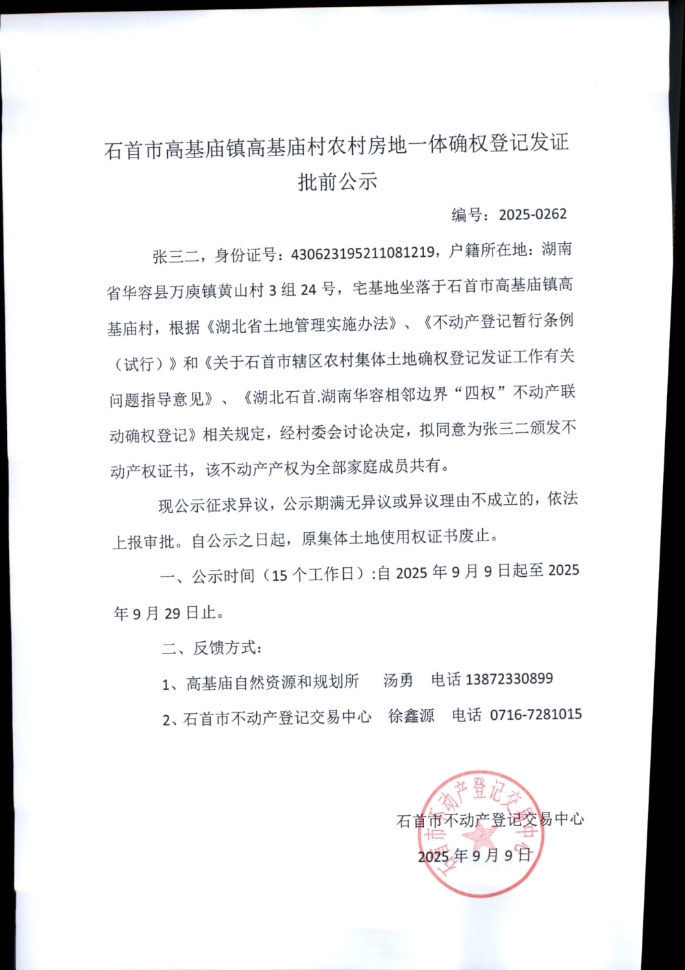 石首市高基庙镇高基庙村农村房地一体确权登记发证批前公示( 张三二)