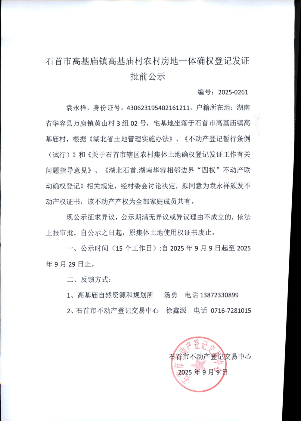 石首市高基庙镇高基庙村农村房地一体确权登记发证批前公示( 袁永祥)