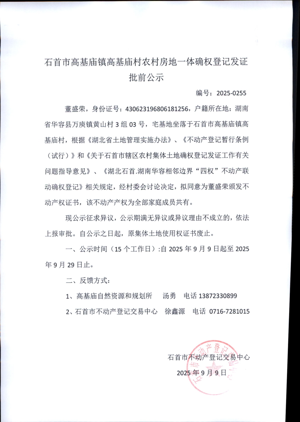石首市高基庙镇高基庙村农村房地一体确权登记发证批前公示( 董盛荣)