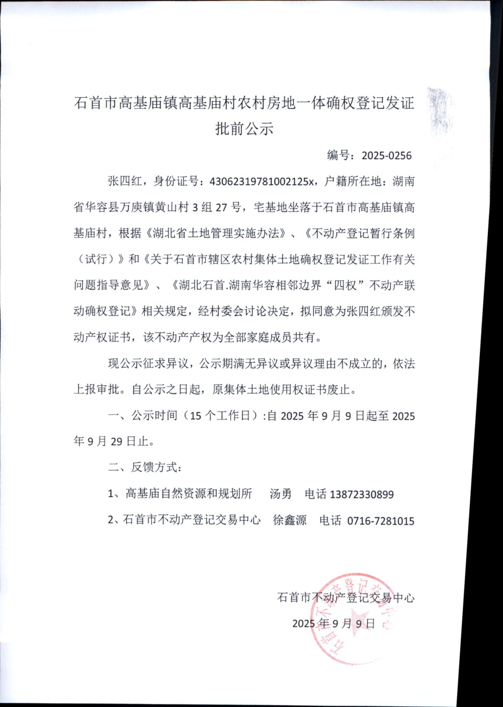 石首市高基庙镇高基庙村农村房地一体确权登记发证批前公示( 张四红)
