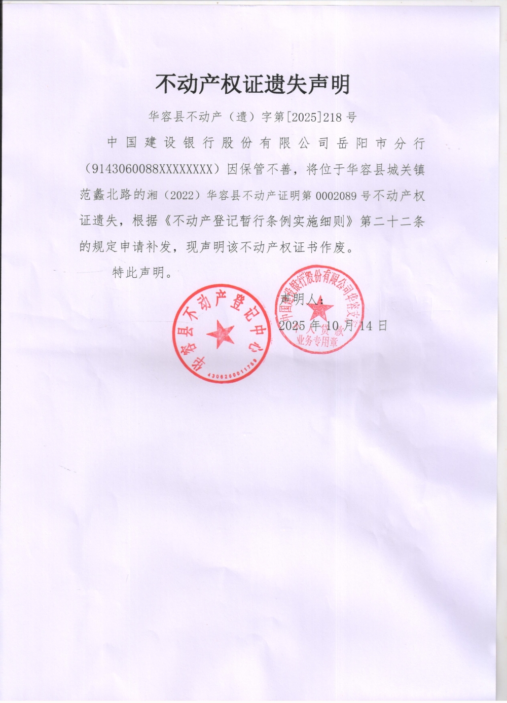 不动产权证遗失声明(中国建设银行股份有限公司岳阳 市分行)