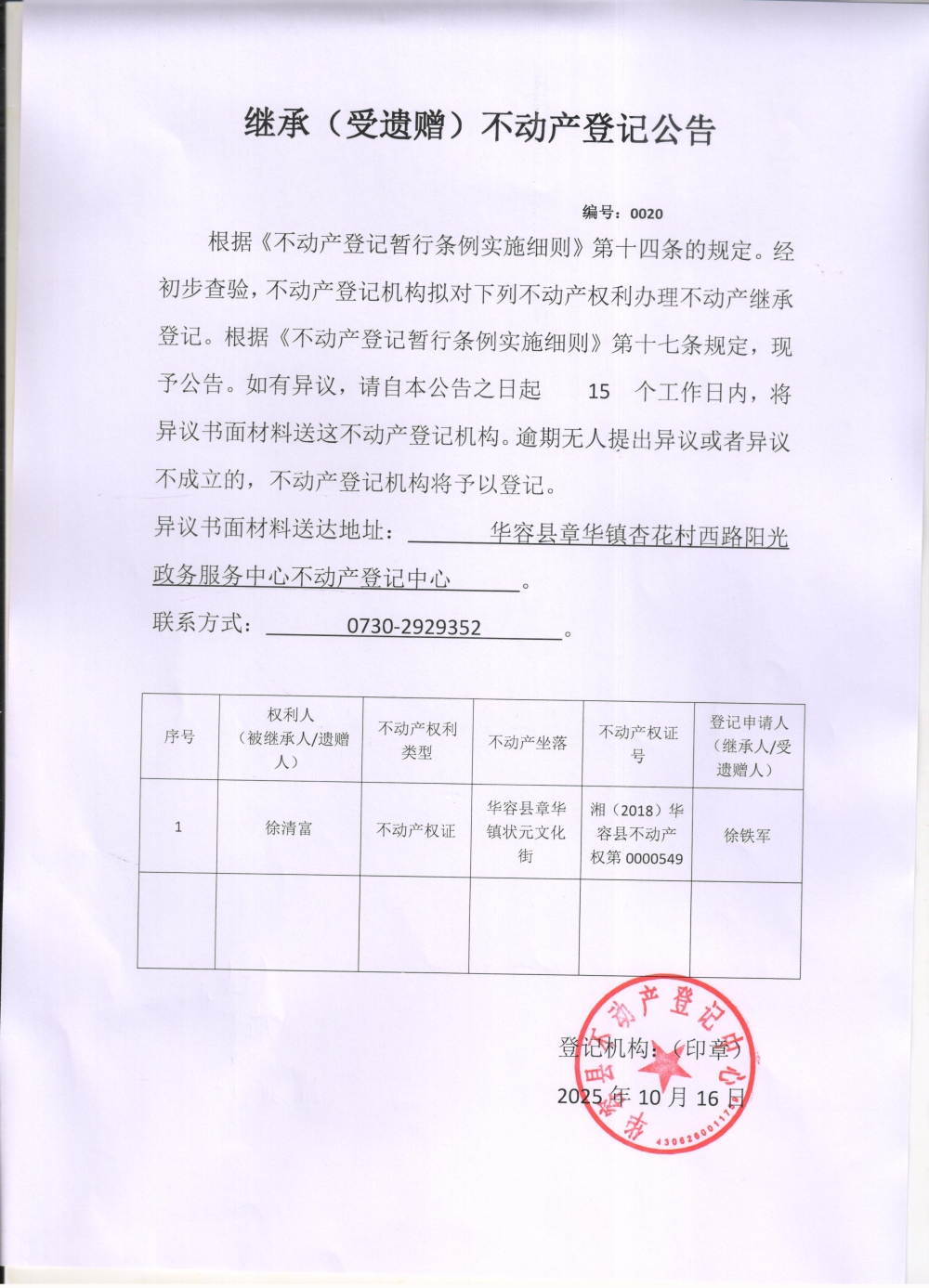 继承(受遗赠)不动产登记公告(徐清富转徐铁军)