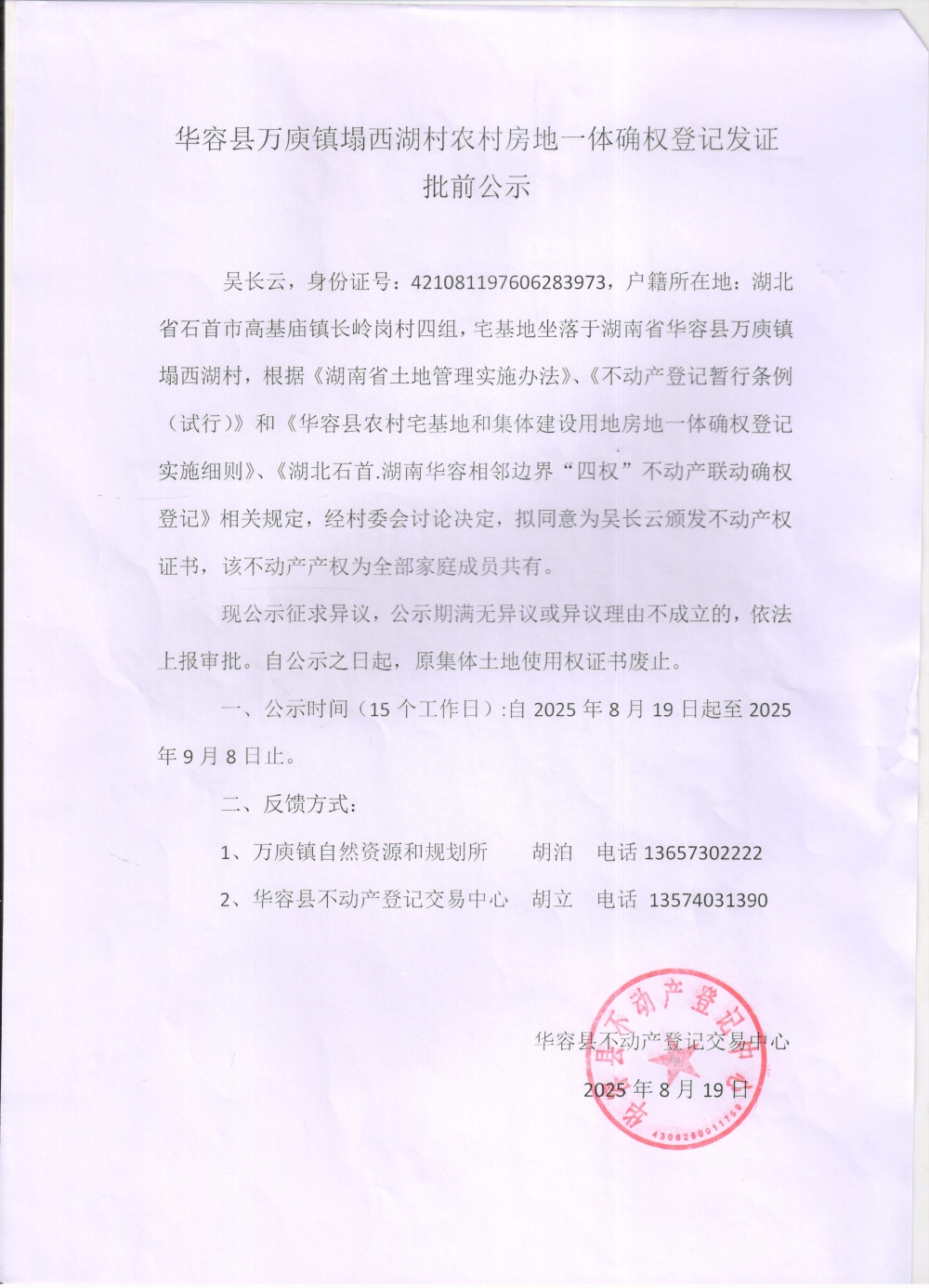 华容县万庾镇塌西湖村农村房地一体确权登记发证批前公示(吴长云)