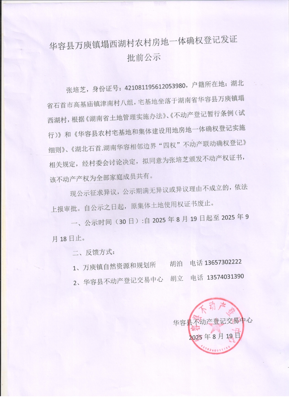 华容县万庾镇塌西湖村农村房地一体确权登记发证批前公示(张培芝)