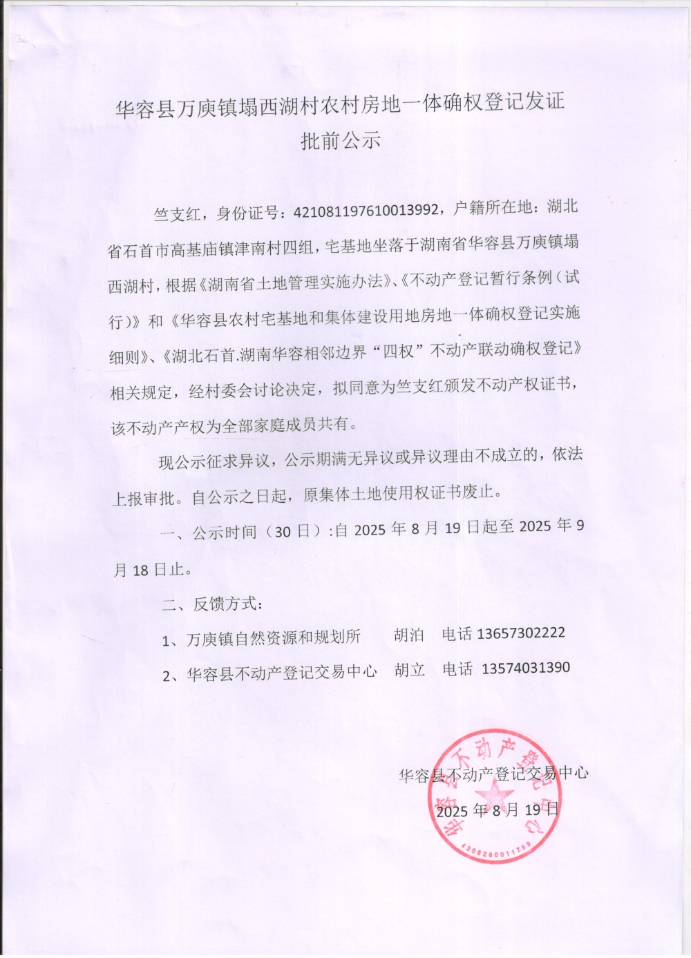 华容县万庾镇塌西湖村农村房地一体确权登记发证批前公示(竺支红)