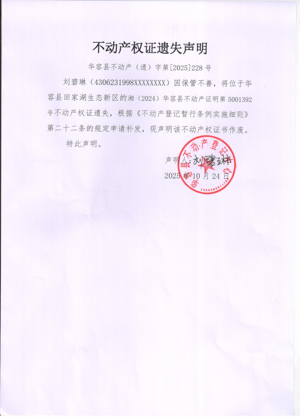 不动产权证遗失声明(刘碧琳)