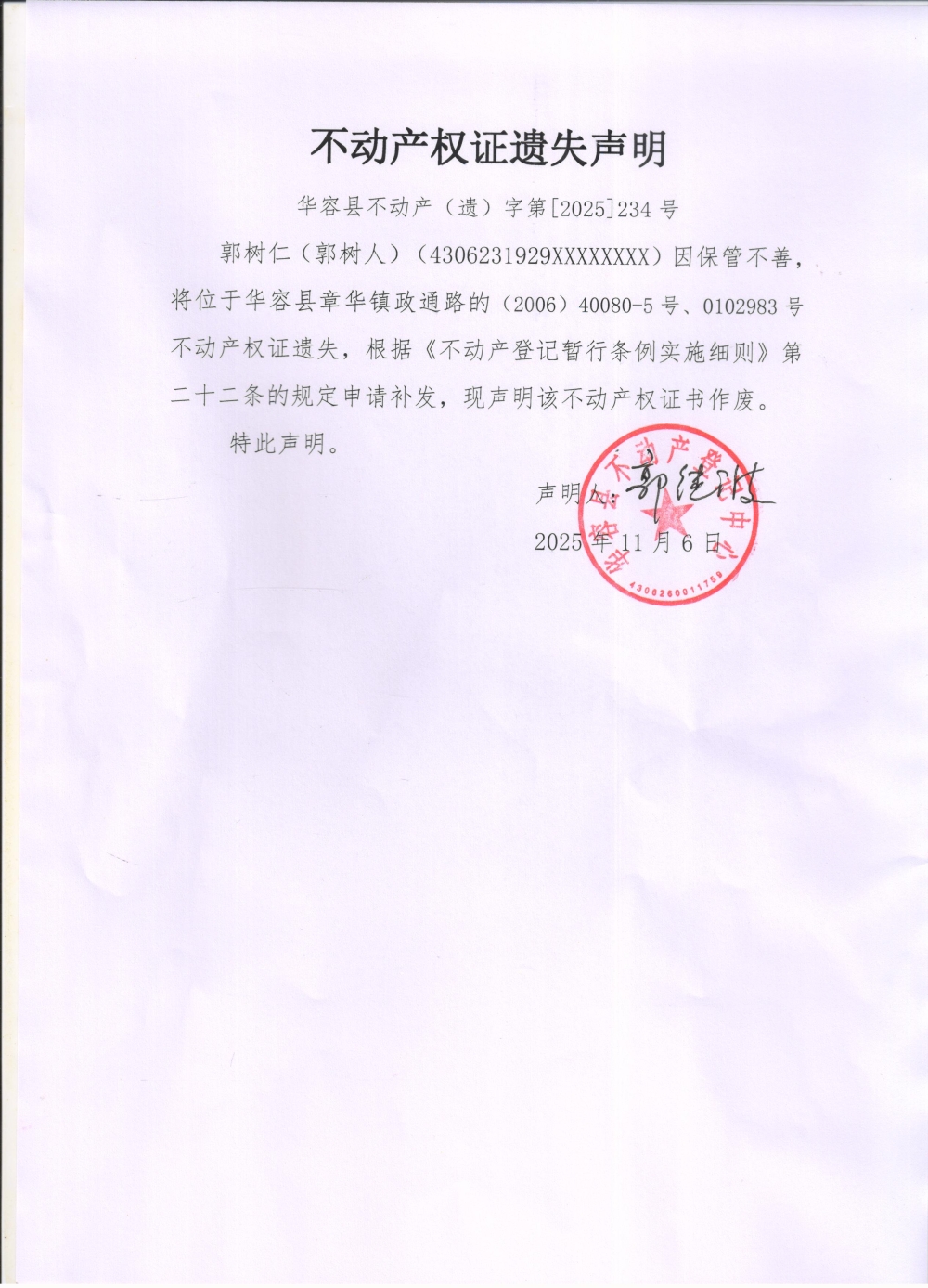 不动产权证遗失声明(郭树仁(郭树人))