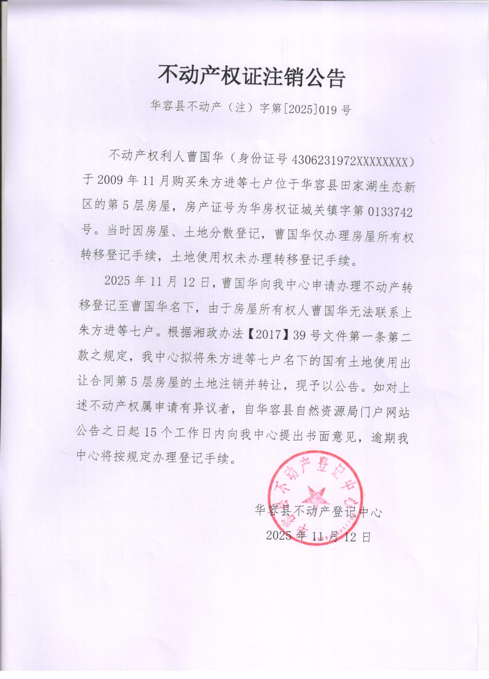不动产权证注销公告(朱方进转曹国华)