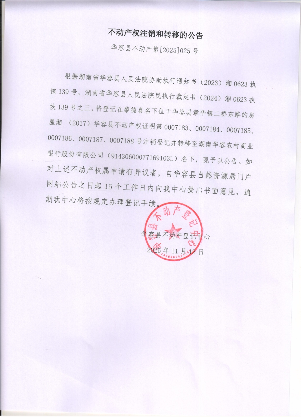 不动产权证注销和转移公告(黎德喜转湖南华容农村商业银行股份有限公司)