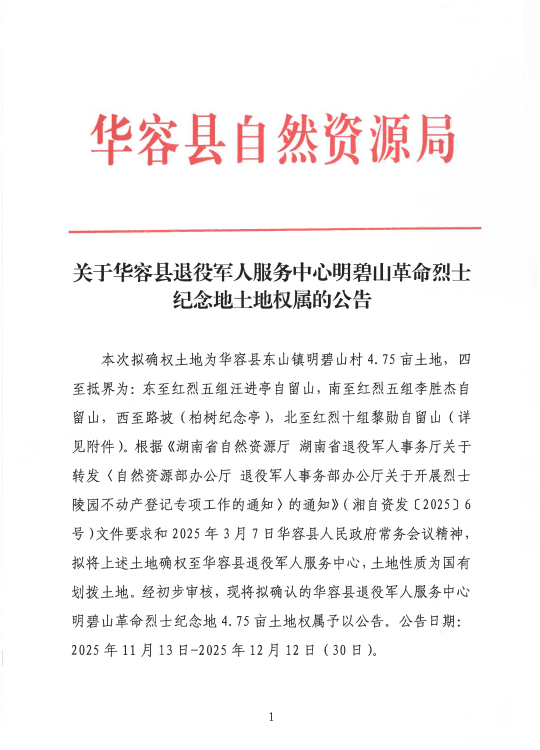 关于华容县退役军人服务中心明碧山革命烈士纪念地土地权属的公告