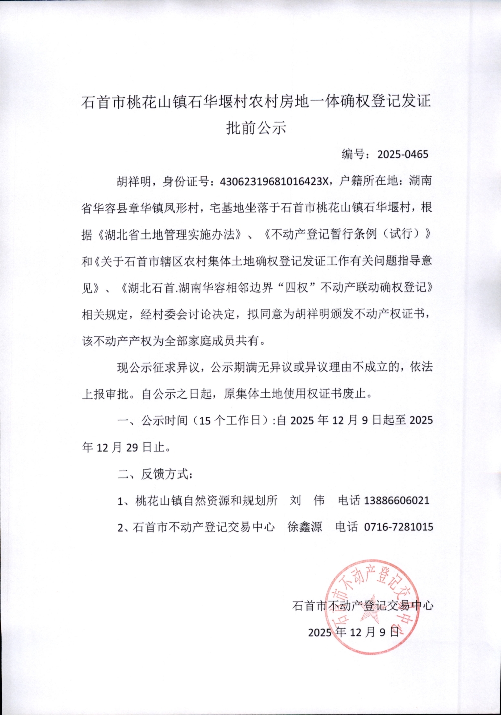 石首市桃花山镇石华堰农村房地一体确权登记发证(胡祥明)
