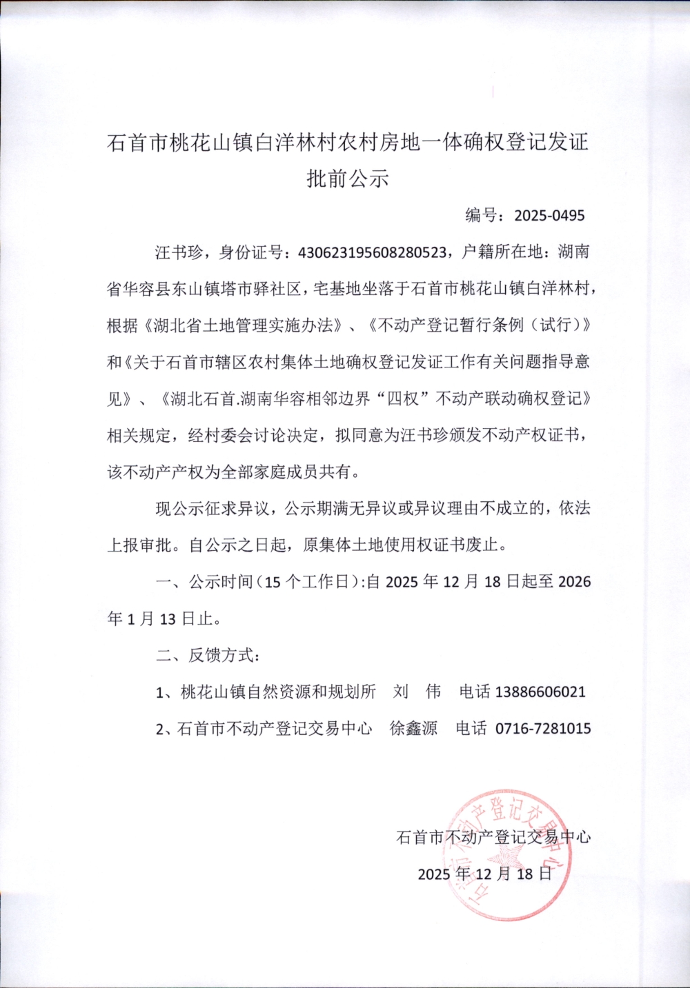 石首市桃花山镇白洋林村农村房地一体确权登记发证(汪书珍)