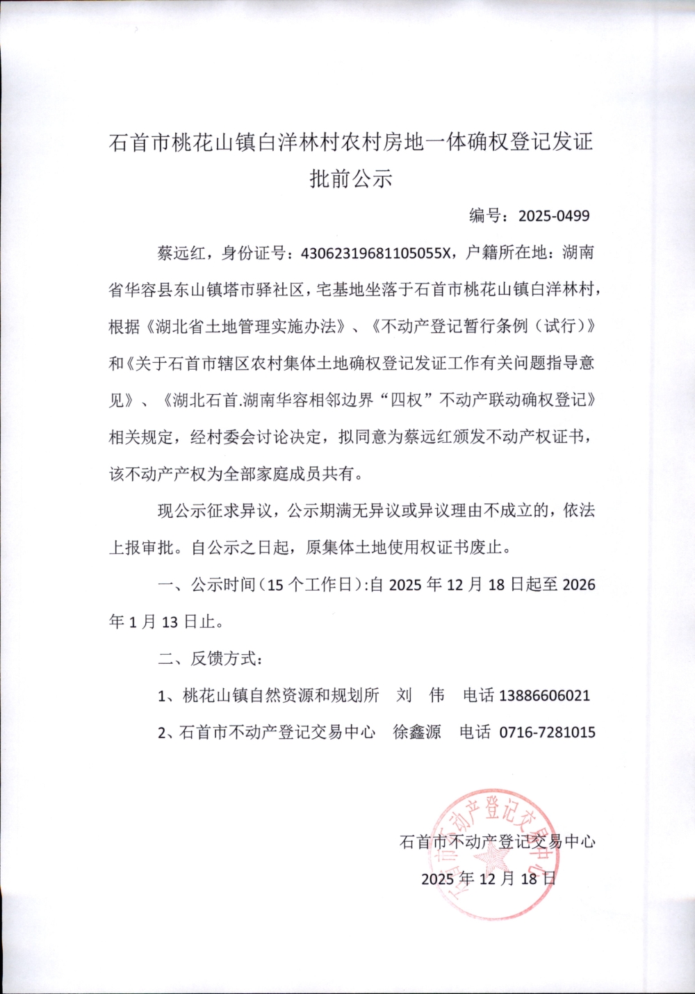石首市桃花山镇白洋林村农村房地一体确权登记发证(蔡远红)