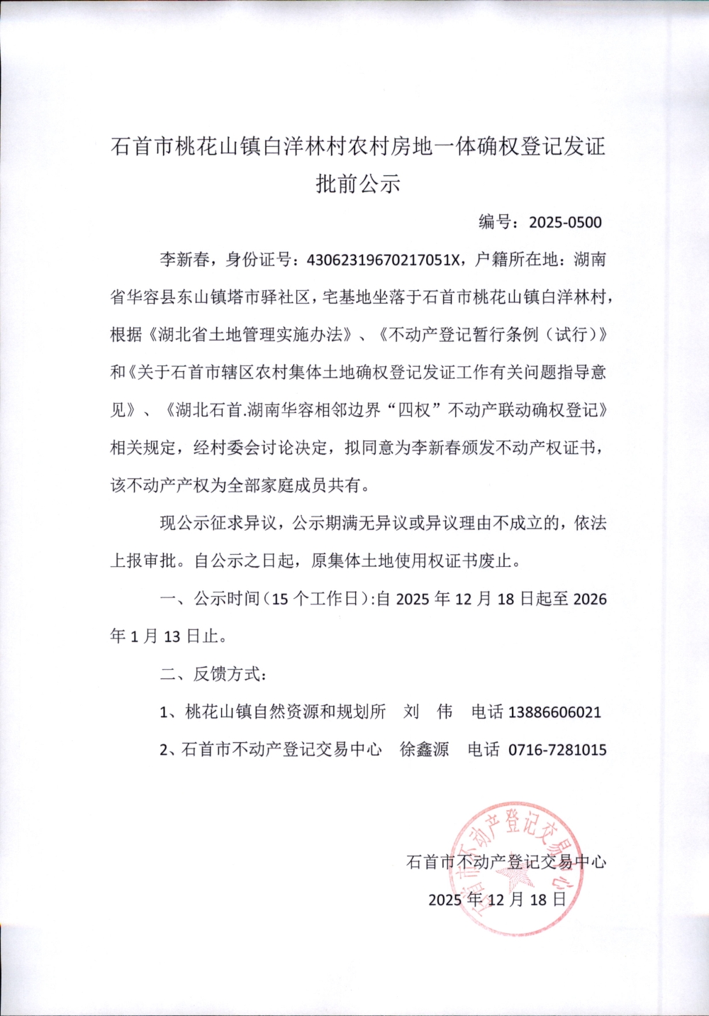 石首市桃花山镇白洋林村农村房地一体确权登记发证(李新春)