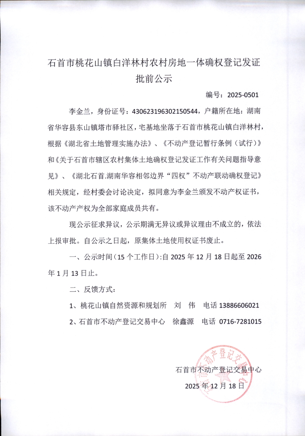 石首市桃花山镇白洋林村农村房地一体确权登记发证(李金兰)