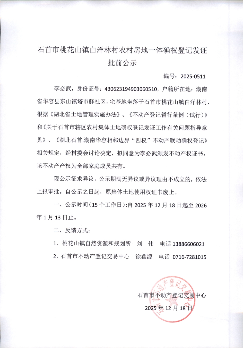 石首市桃花山镇白洋林村农村房地一体确权登记发证(李必武)