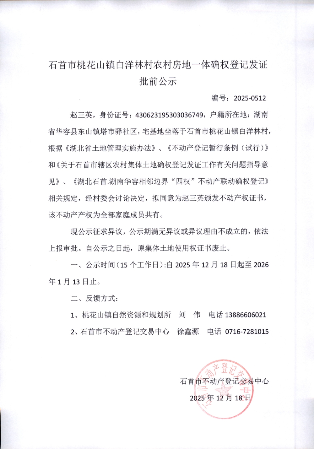石首市桃花山镇白洋林村农村房地一体确权登记发证(赵三英)