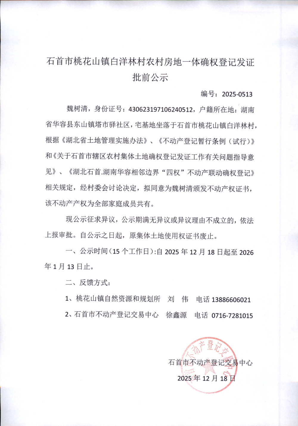 石首市桃花山镇白洋林村农村房地一体确权登记发证(魏树清)