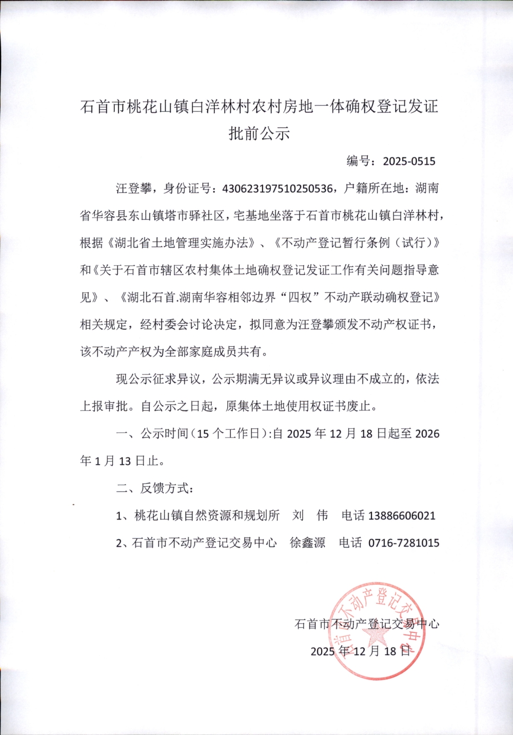 石首市桃花山镇白洋林村农村房地一体确权登记发证(汪登攀)