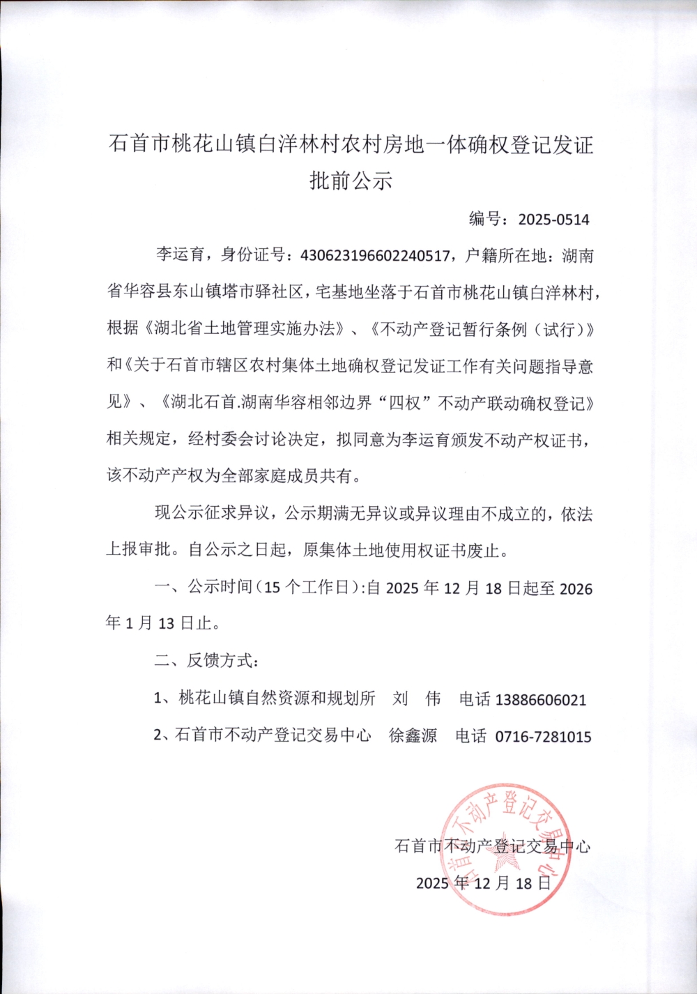 石首市桃花山镇白洋林村农村房地一体确权登记发证(李运育)